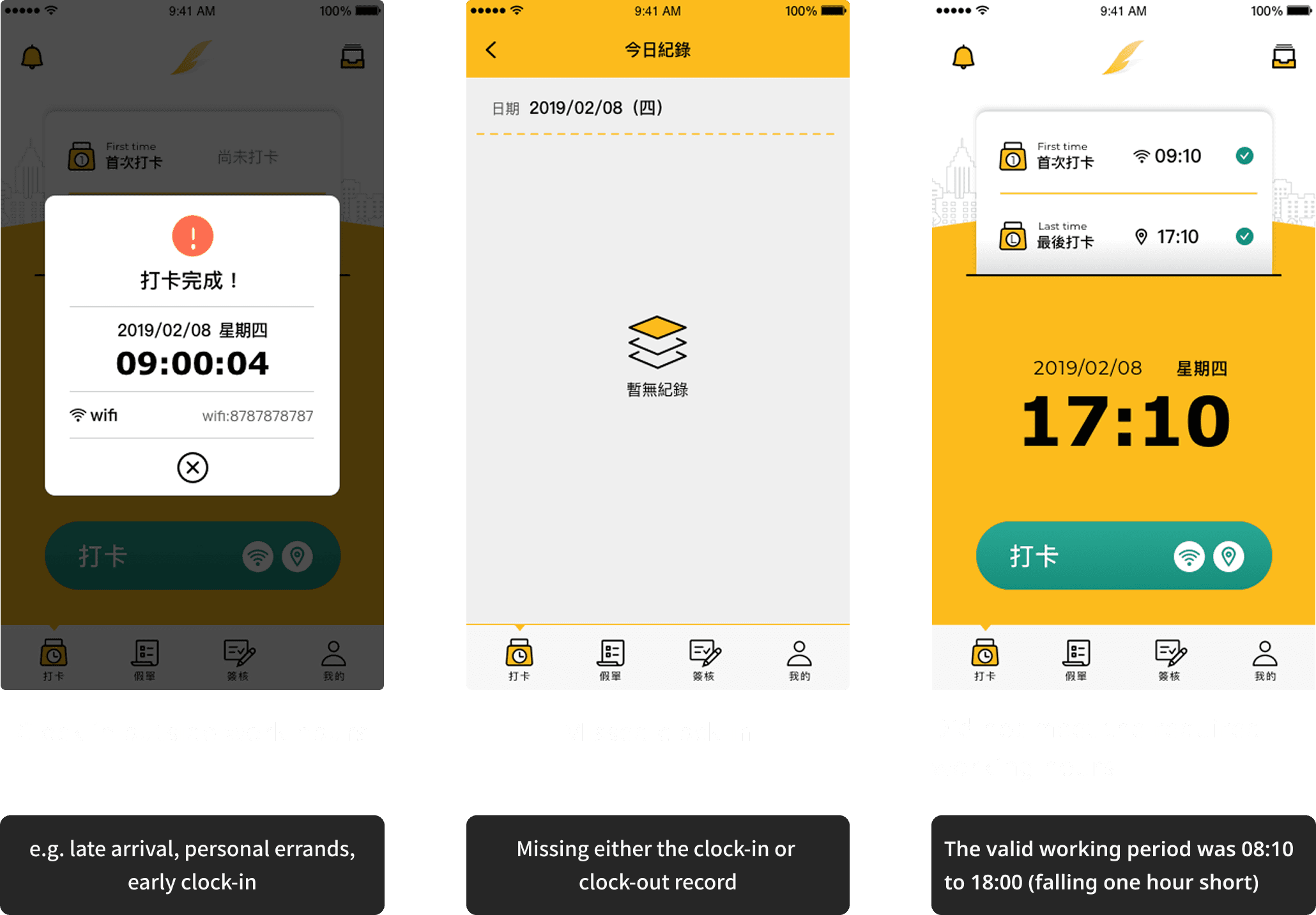 After confirming the core clock-in behavior, we also addressed other common usage scenarios, such as incorrect clock-ins, late arrivals, missed clock-ins, and early clock-ins.