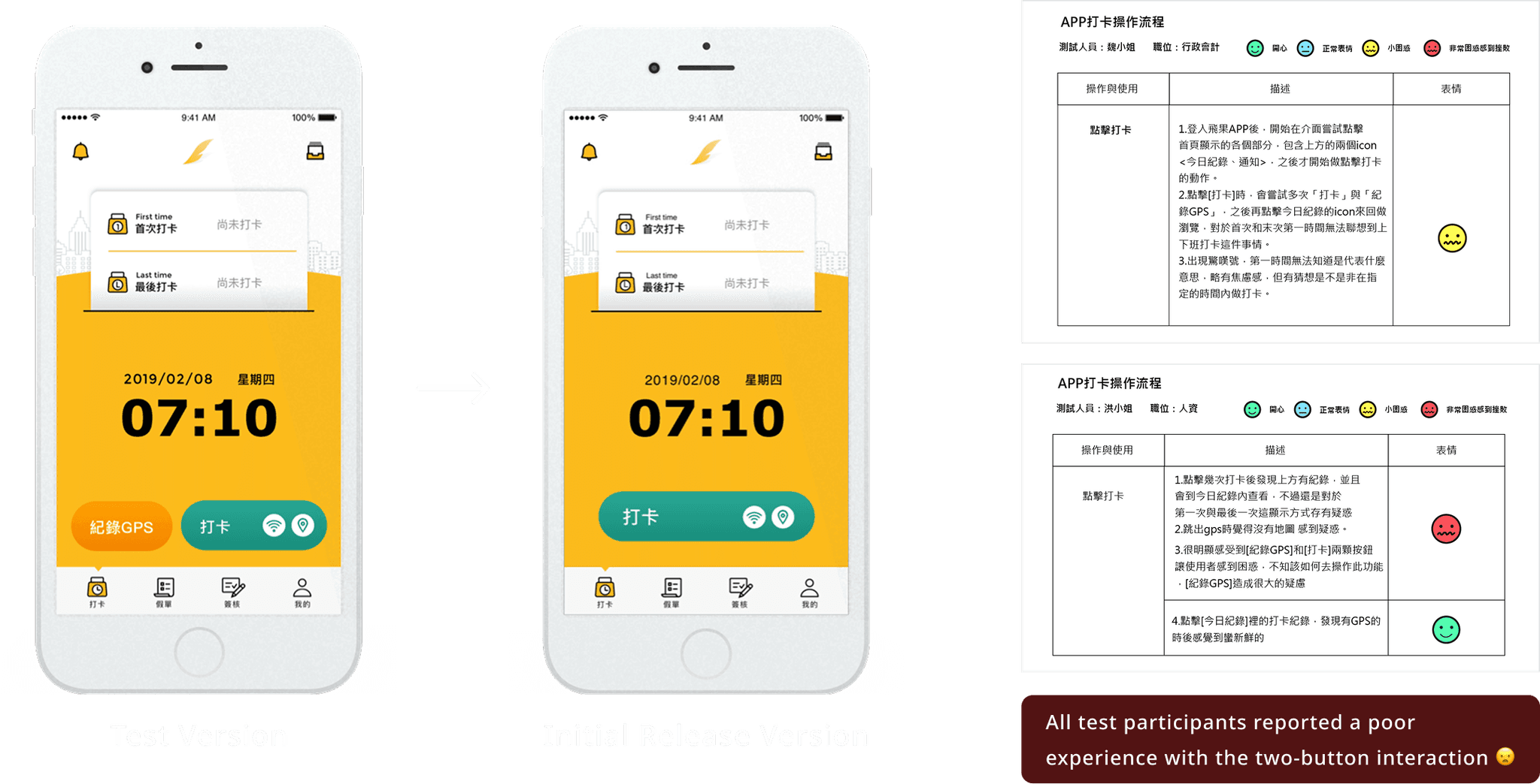 The test results showed that the “Record GPS” button caused user confusion, which negatively impacted clock-in efficiency. As a result, the design was adjusted to a one-tap clock-in flow and released for further validation.