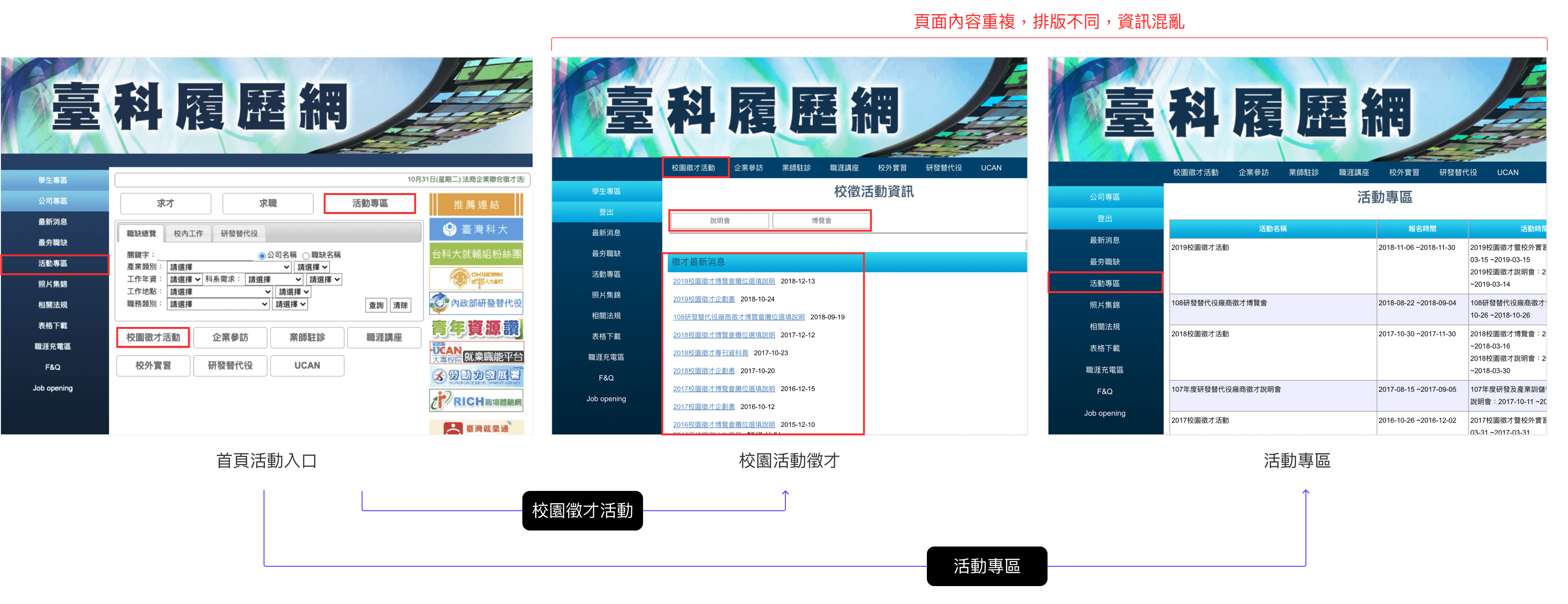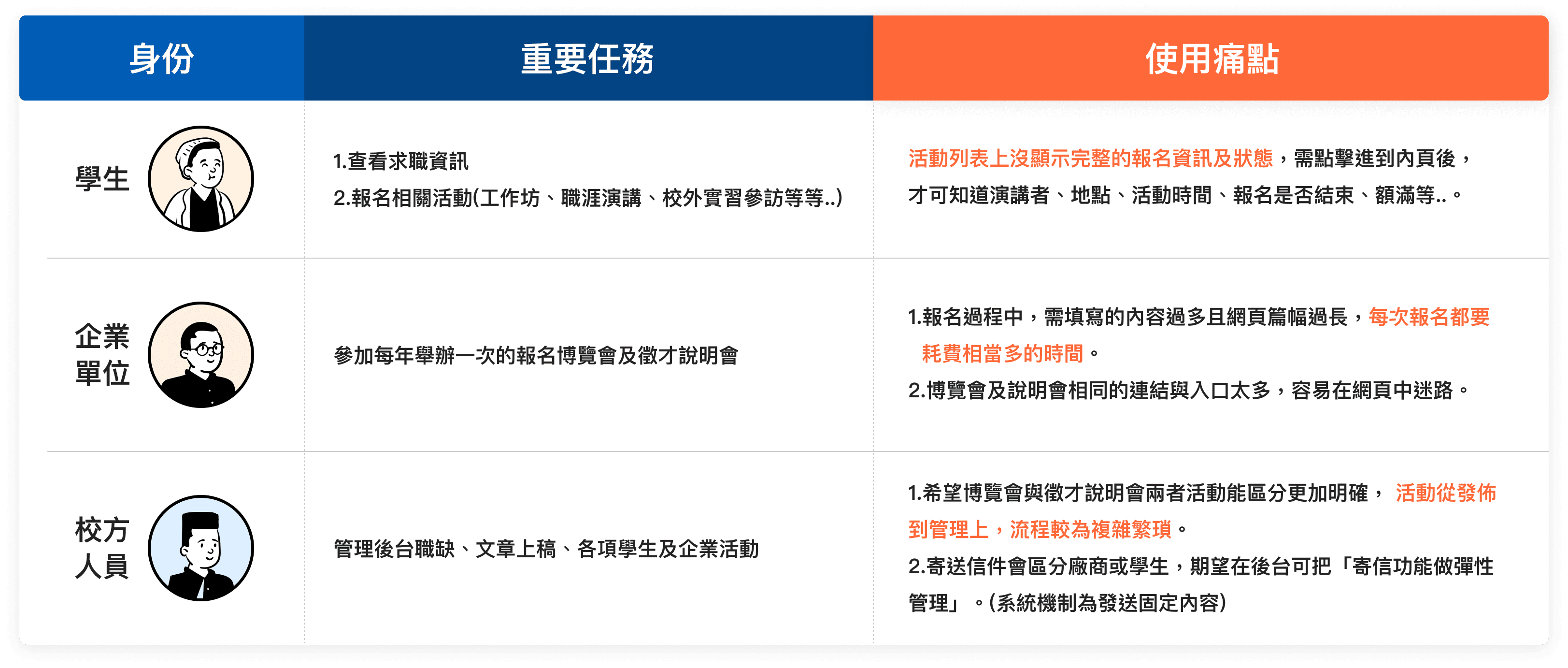 網站使用者主要分為三種身份,1.學生、2.企業單位、3.校方人員,訪談後歸納出這三者角色在舊網頁執行操作與使用上的痛點。