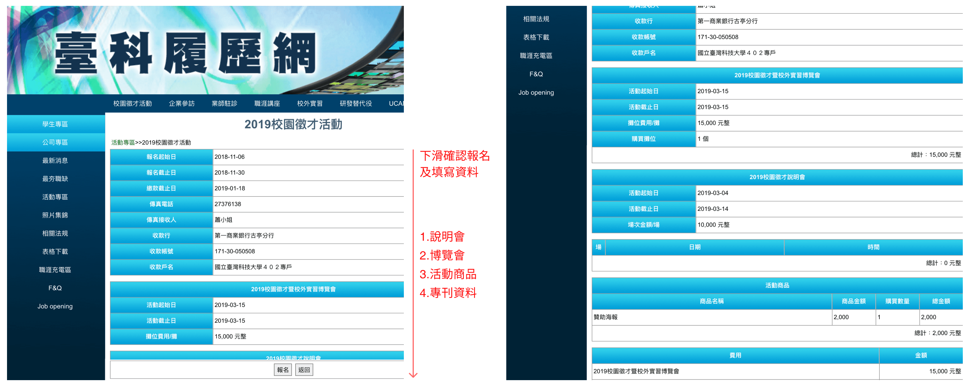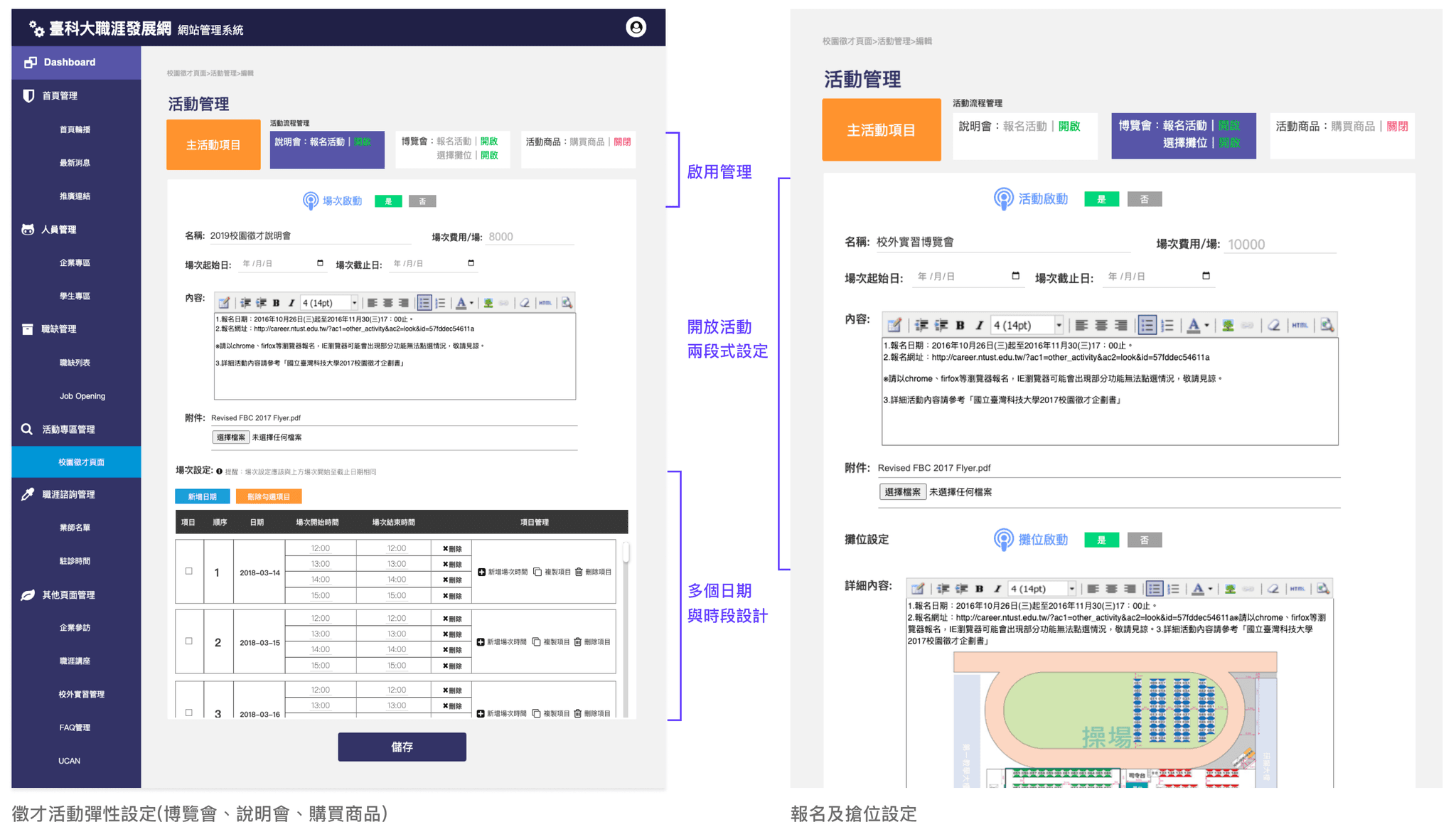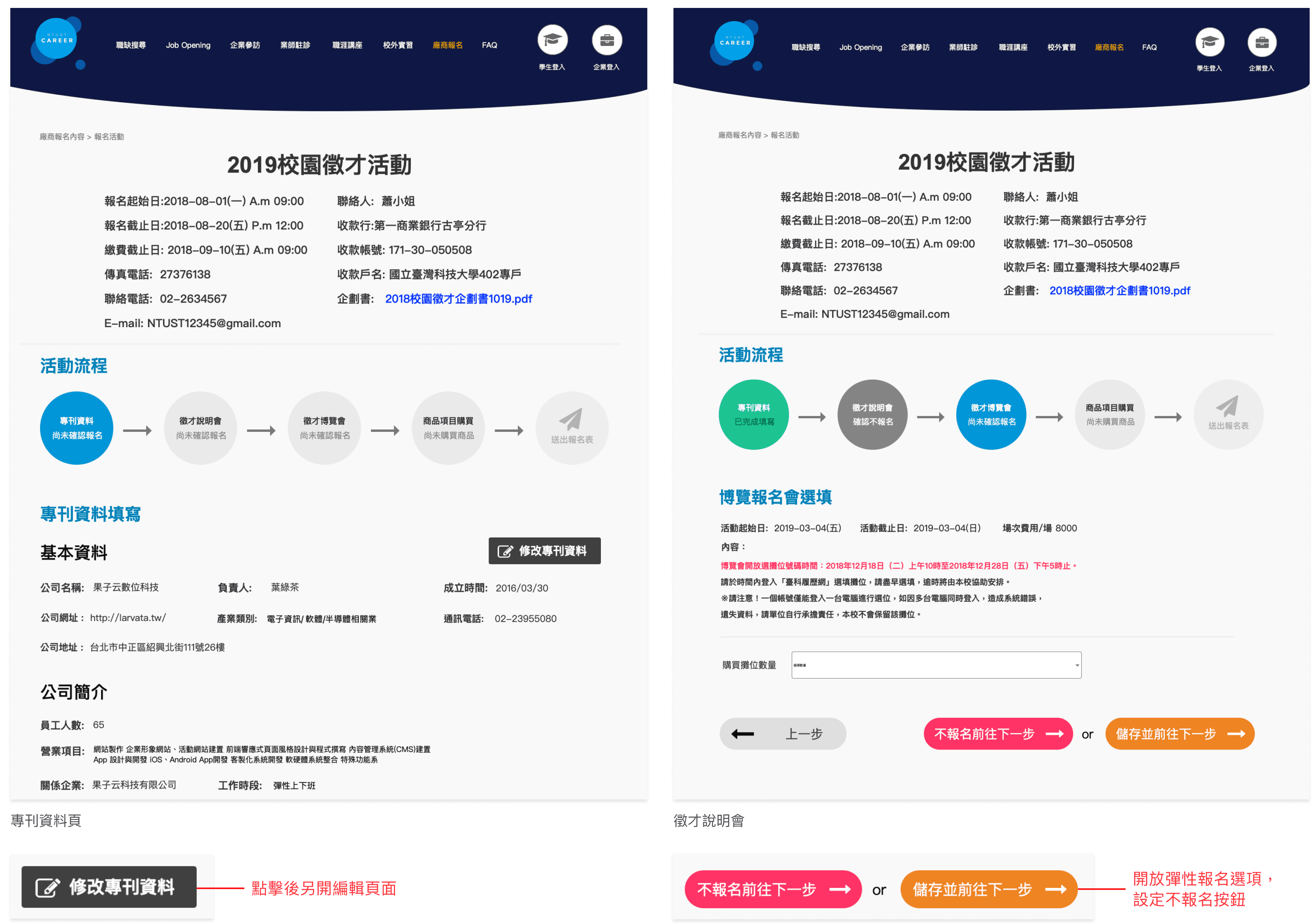 活動開放:彈性開放活動細項以利管理員方便上架徵才活動,改善舊有一頁式較難管控的耗時流程,而每個活動開關也對應到前台的頁籤顯示。