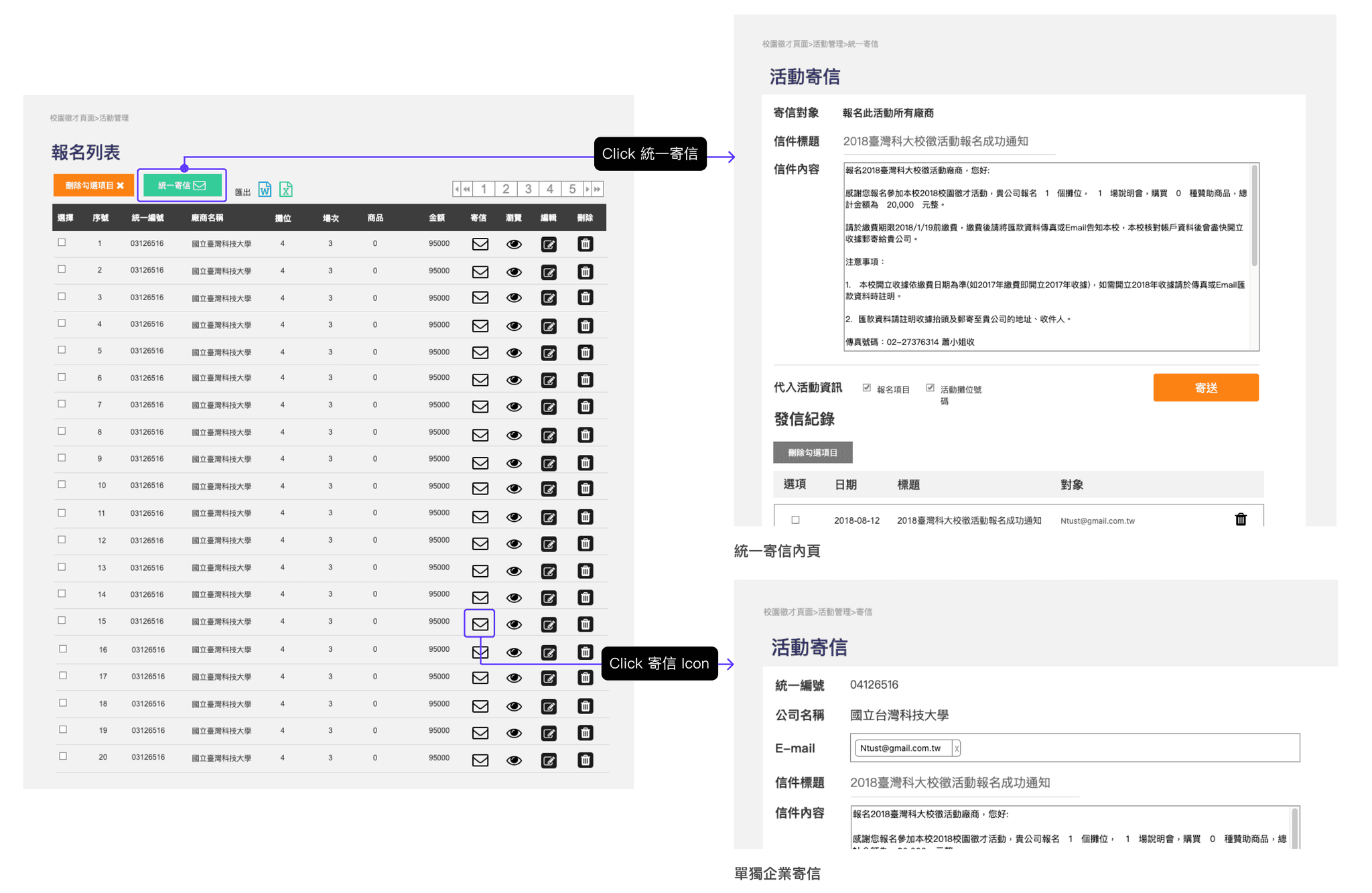 列表上可選擇「統一寄信」或點選列表上的「寄信」圖標,原機制為系統發出固定信件,新功能改為由後台統一寄信外,也可單獨對廠商進行寄件,同時在處理不同廠商與學生報名活動時,可快速追蹤報名進度,不用額外另開信箱寄信。