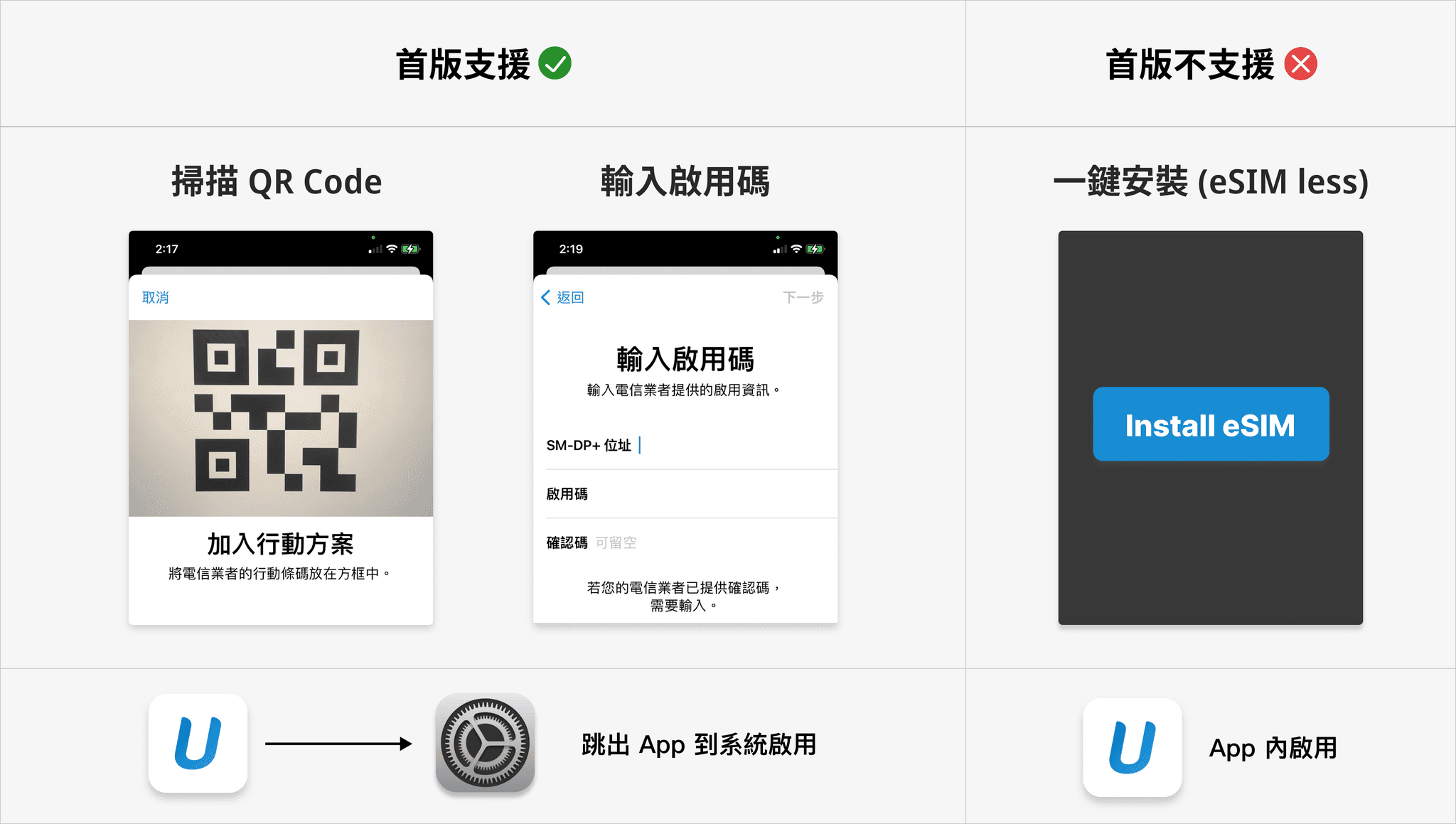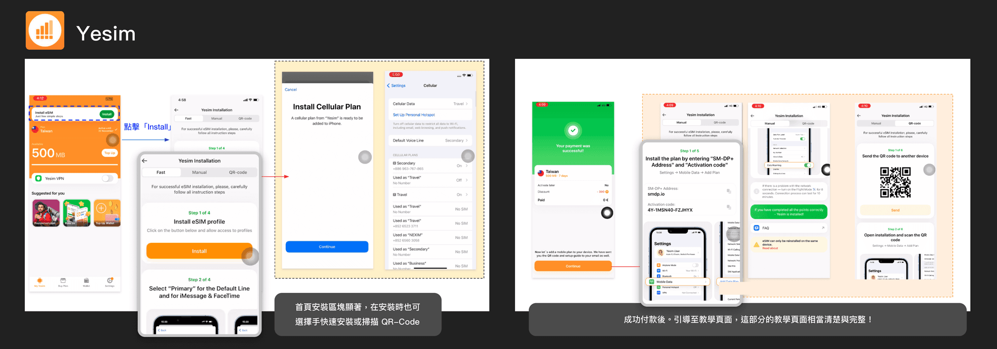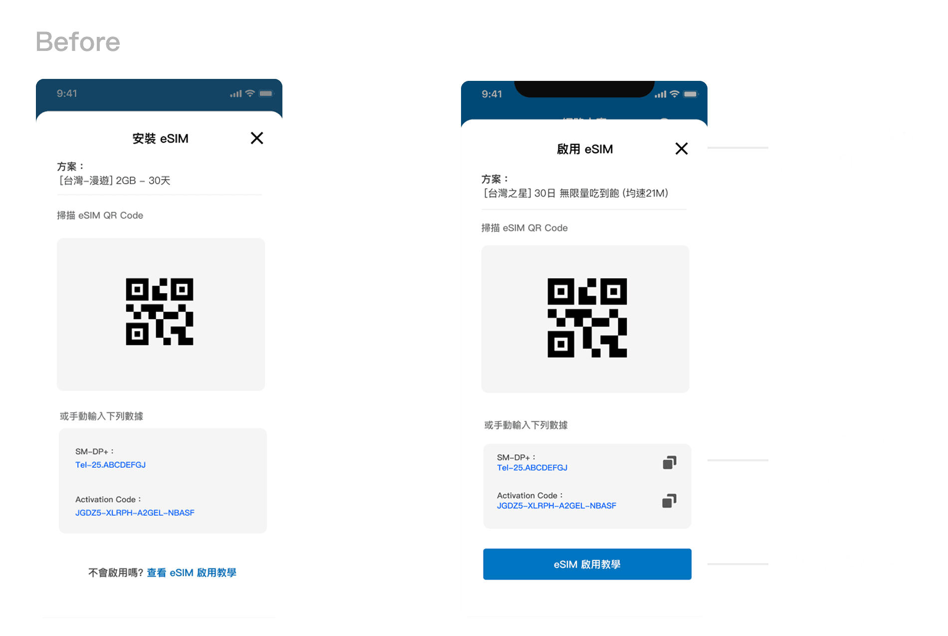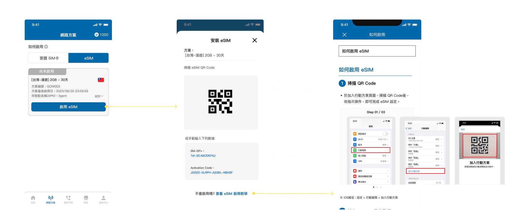 由於 eSIM 的啟用流程較為複雜,使用者需暫時離開 App,前往裝置系統中透過「掃描 QR Code」或「輸入啟用碼」來完成設定,因此這段流程的設計重點在於清楚的操作引導,以降低中斷帶來的困惑。