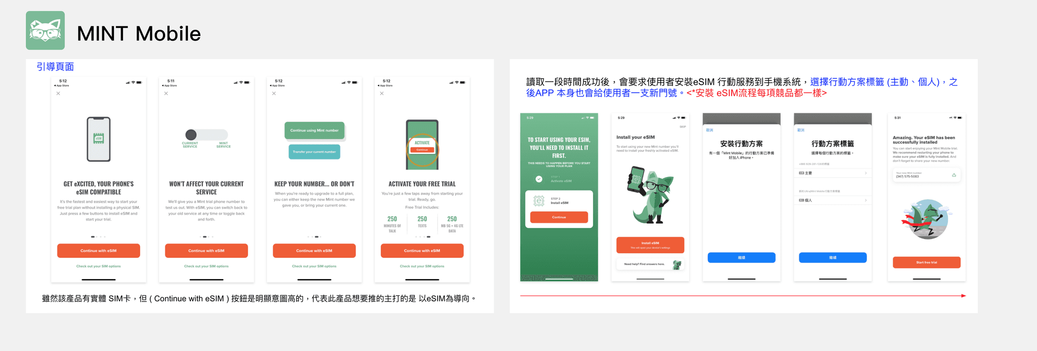 在初步釐清使用者對 eSIM 的需求後,為深入理解 eSIM 使用流程與操作方式,我針對三款具 eSIM 服務 App——Mint Mobile、Yesim、AIRSIM 進行比較分析。分析面向包含:安裝流程、CTA 操作引導、資訊結構與教學輔助,歸納產品的使用體驗優劣,並作為後續設計策略的參考依據。