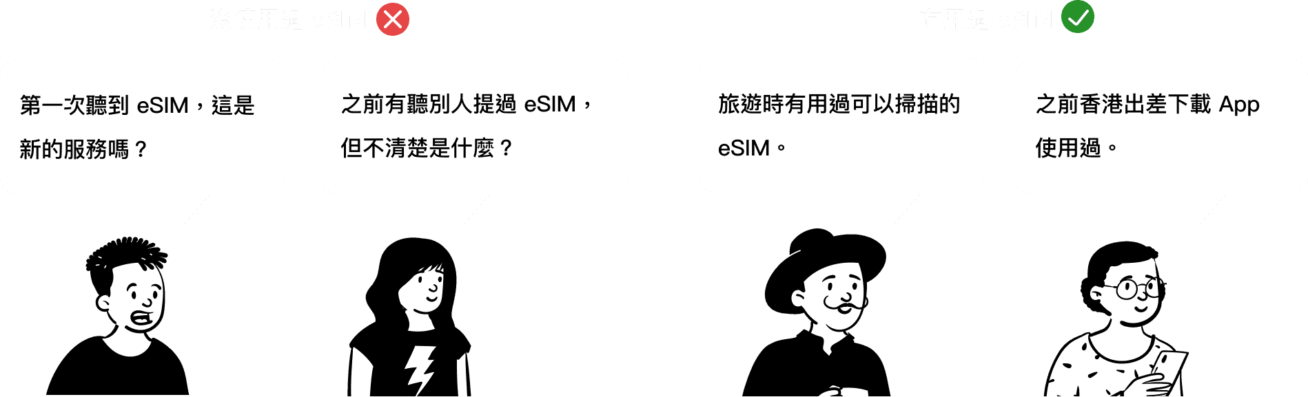 TEL-U 用戶九成以上集中在台灣,旅遊時仍以插卡實體 SIM 為主要上網方式。為初步了解使用者對 eSIM 的認知與使用狀況,我們進行了非正式的探索性訪談,涵蓋日常通勤者、海外旅遊族群與一般手機用戶。結果顯示,多數受訪者對 eSIM 的了解有限,甚至有部分人是首次聽聞此服務,反映出台灣市場對 eSIM 尚處於早期階段,具備推廣與教育的潛力。