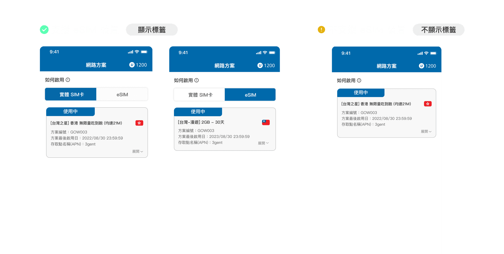 規劃過程中,我提出三個方案與團隊討論,最終選擇「頁籤切換」作為呈現方式,不僅能清楚區分實體 SIM 與 eSIM,也具備直觀易懂的操作體驗。